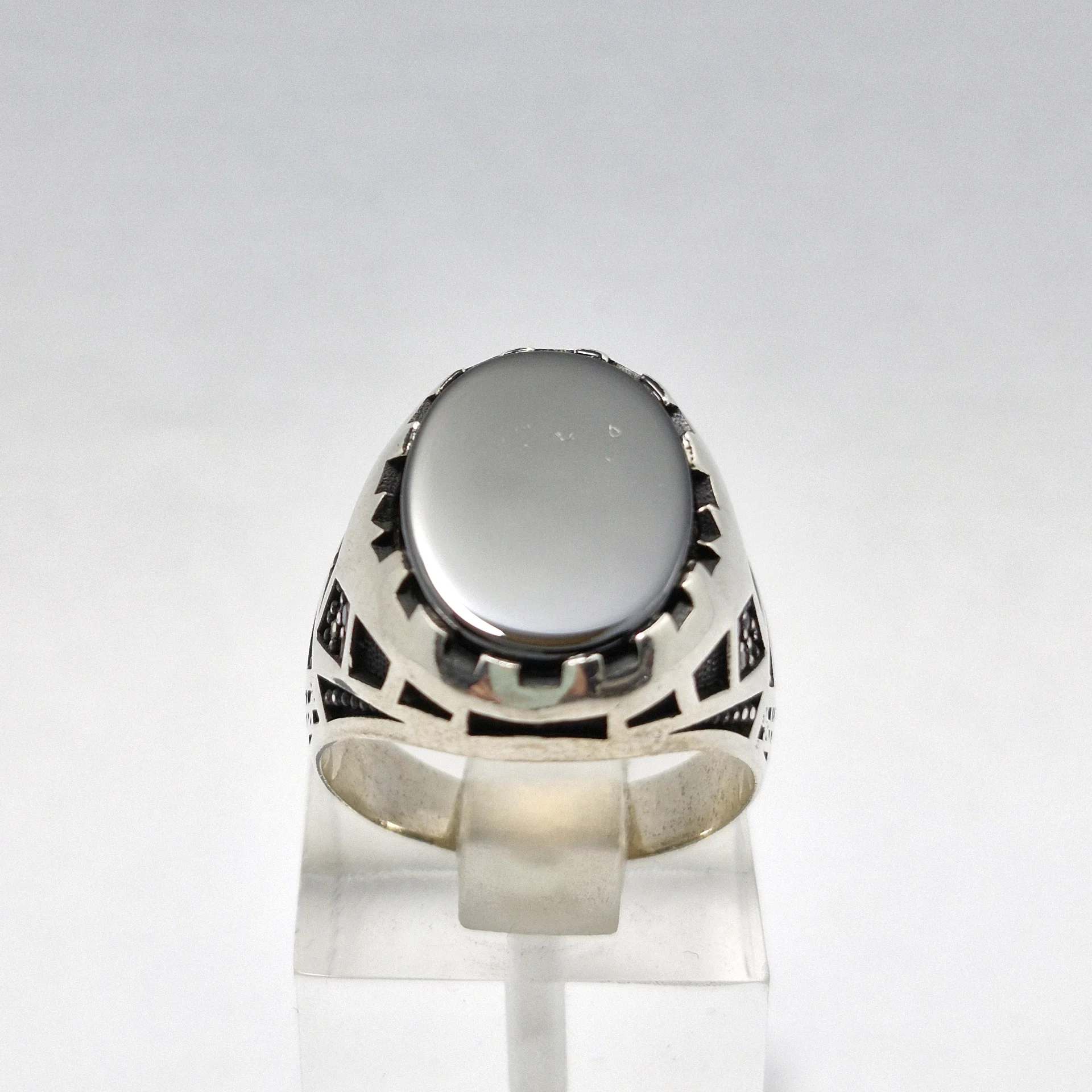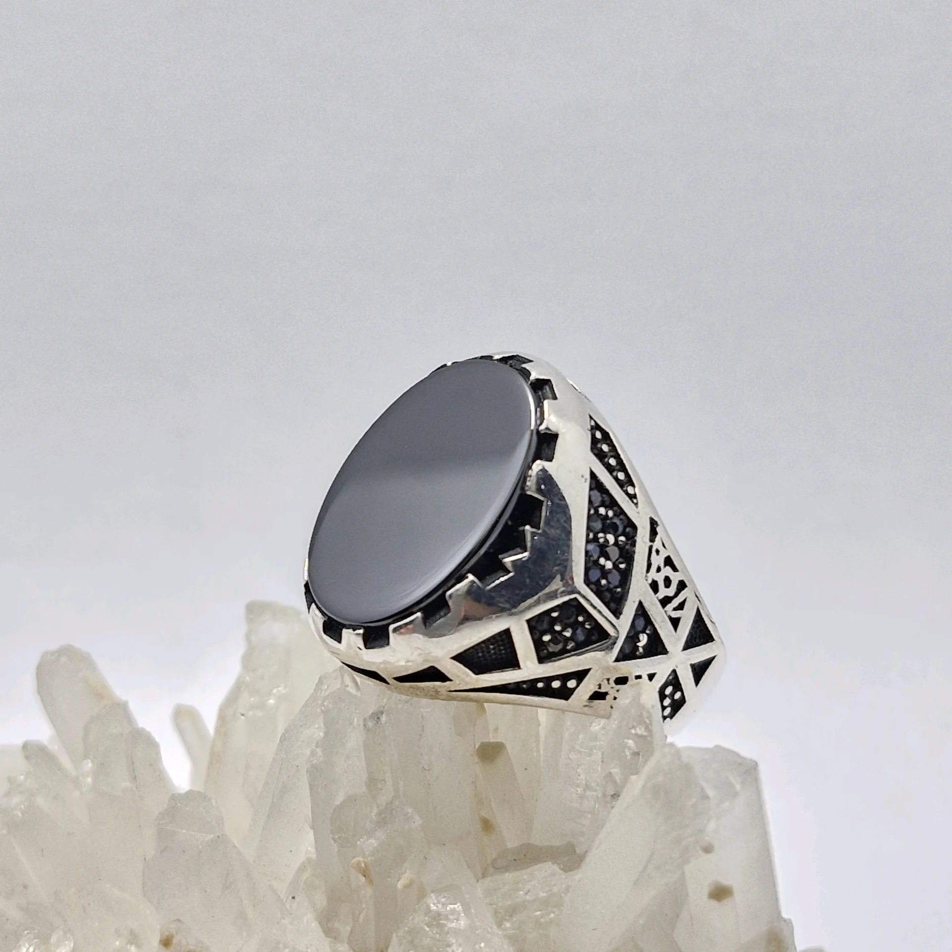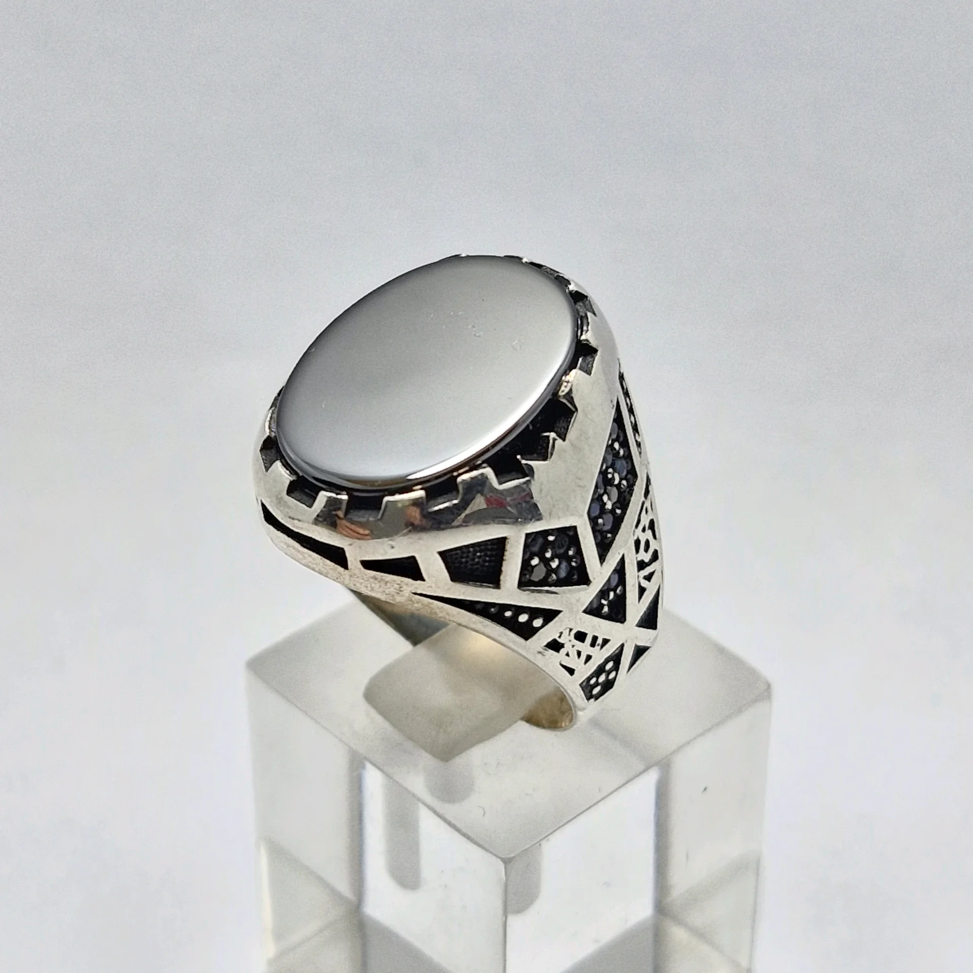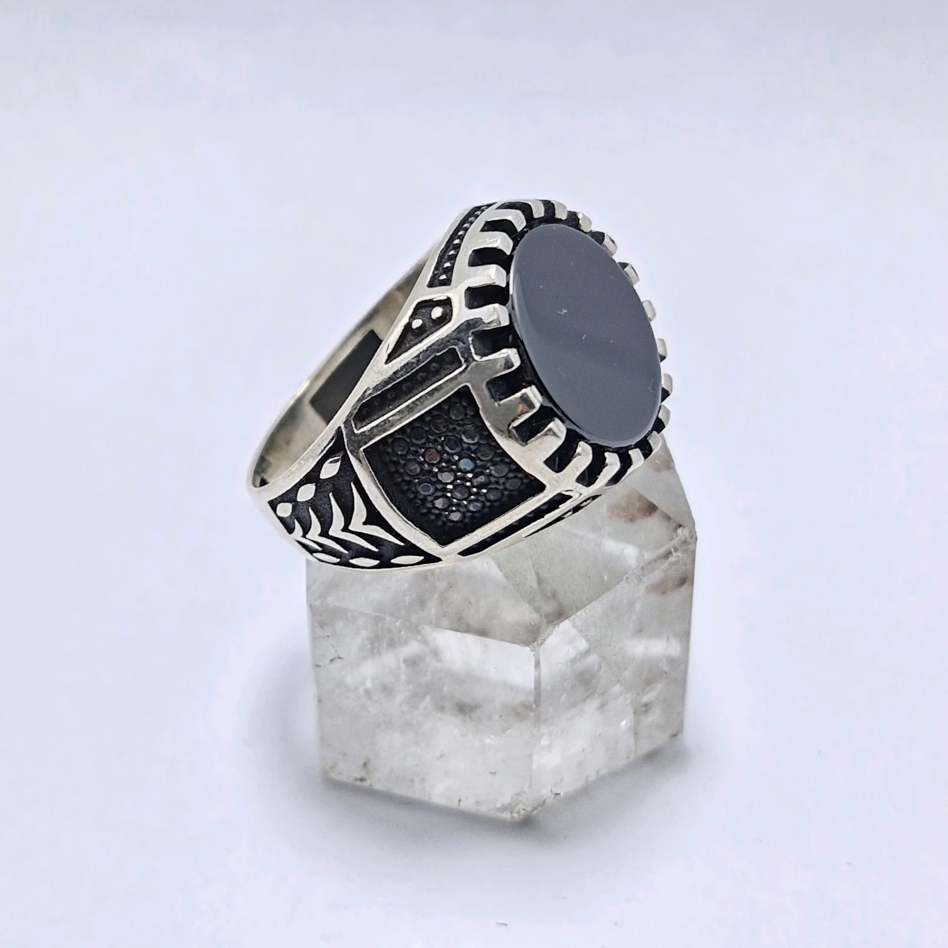 انگشتر نقره سیاه قلم مدل آرمان ، نگین سیاه اتمی مردانه و پسرانه کد Z214 سایز ۱۰، عیار ۹۲۵ ، وزن ۱۰.۹۶ گرم است. رکاب خوش دست و راحت مناسب استفاده روزمره می باشد.