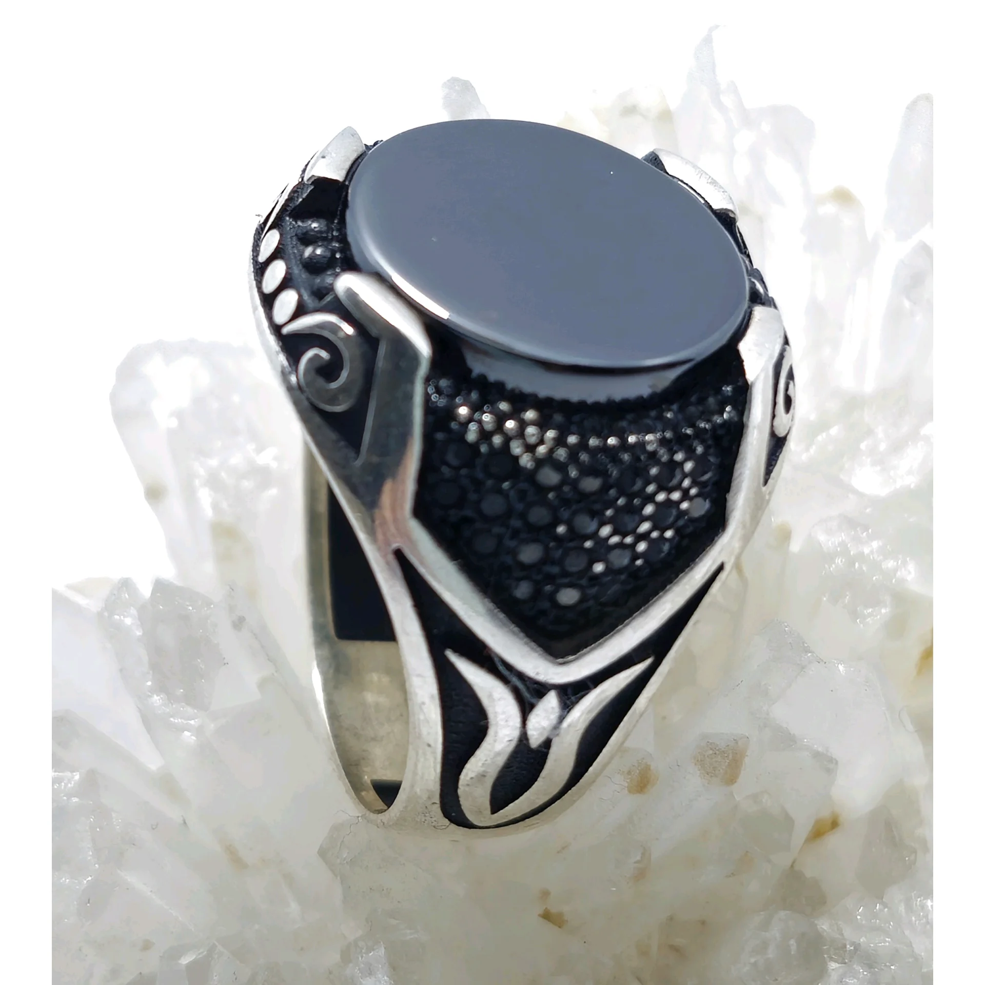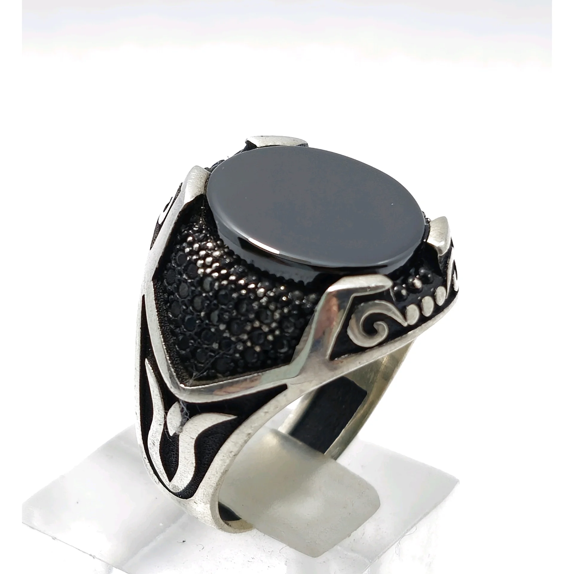 انگشتر نقره سیاه قلم ، نگین سیاه اتمی مردانه و پسرانه کد Z197 سایز ۹، عیار ۹۲۵ ، وزن ۱۰.۶۹ گرم است. رکاب خوش دست و راحت مناسب استفاده روزمره می باشد.