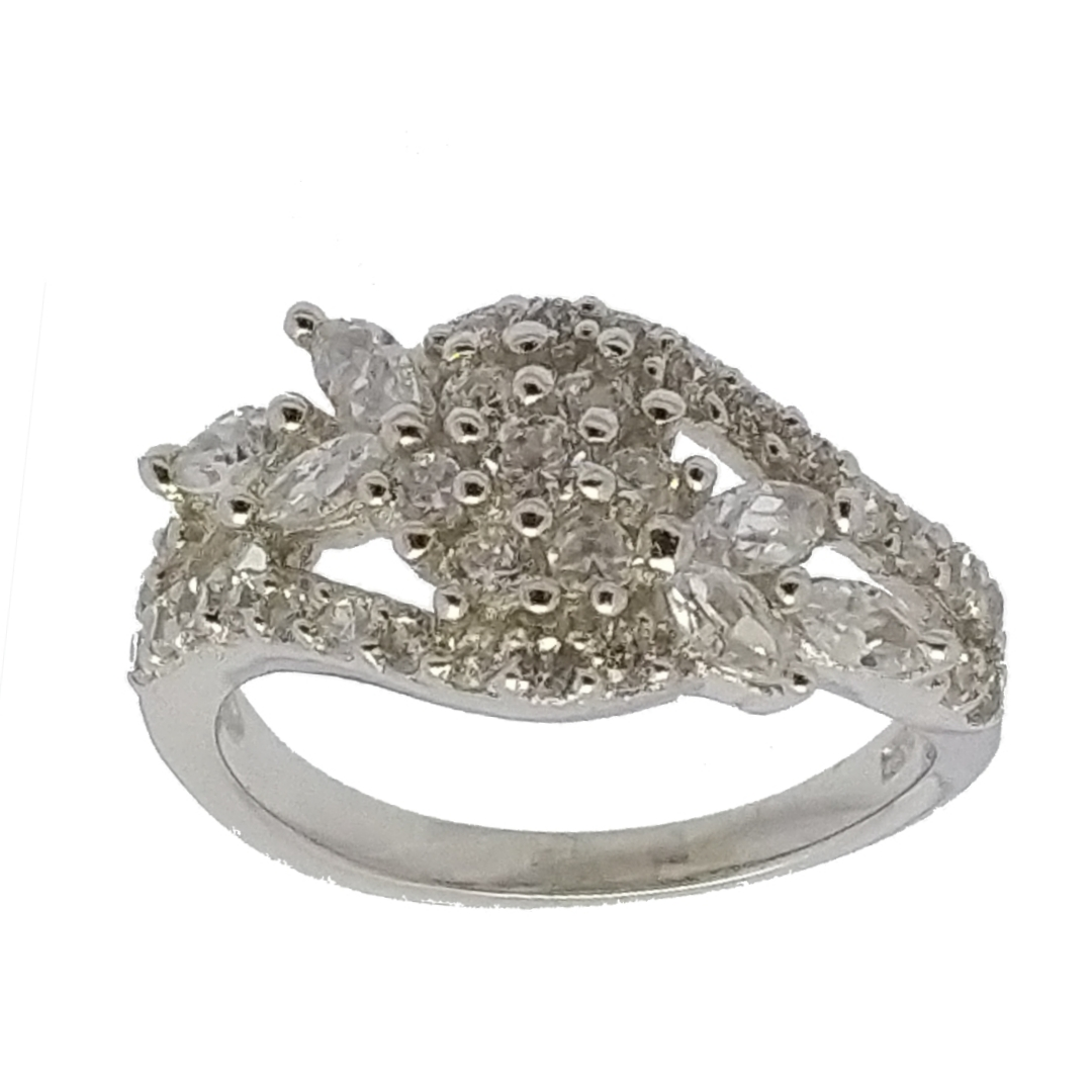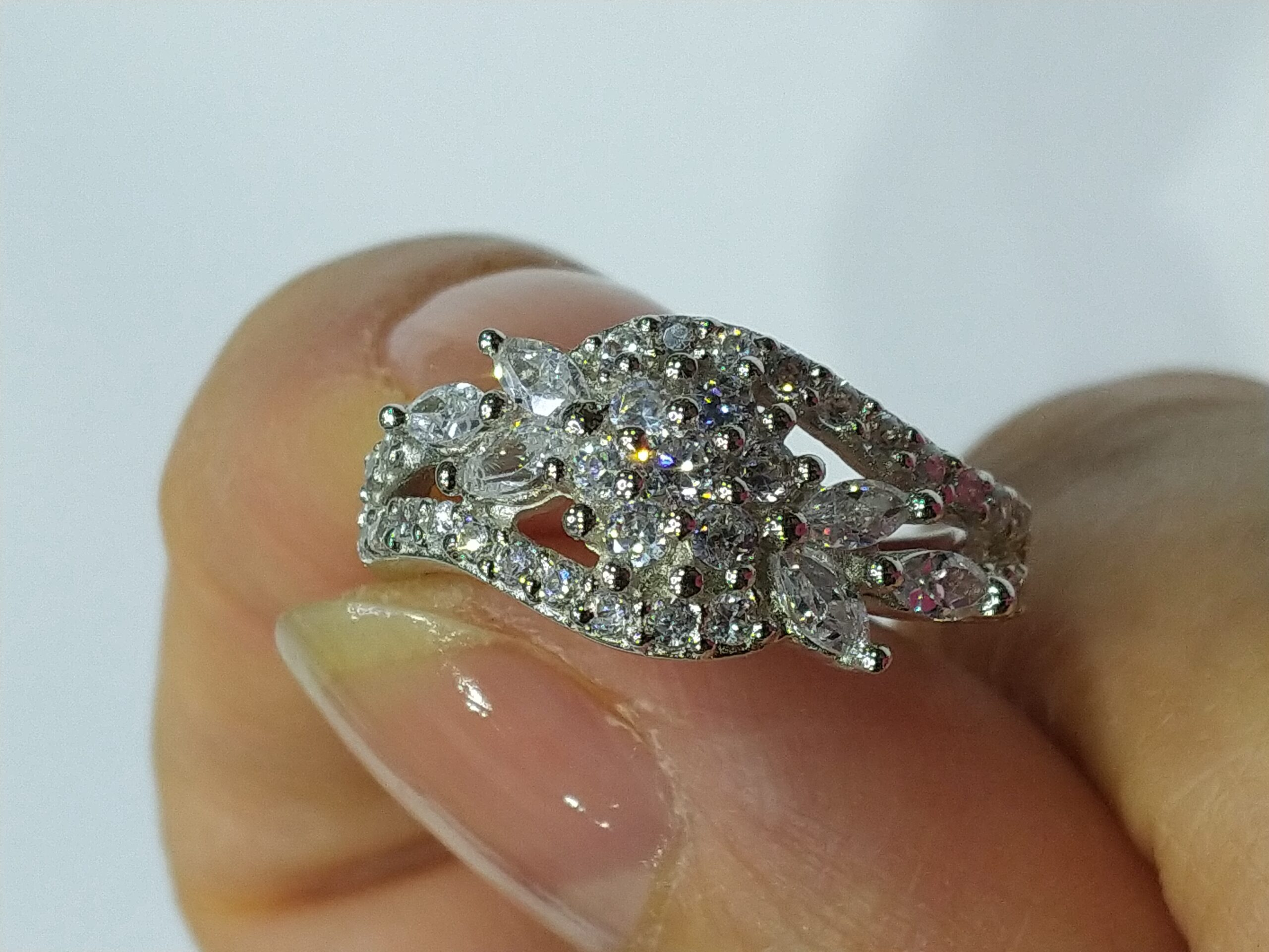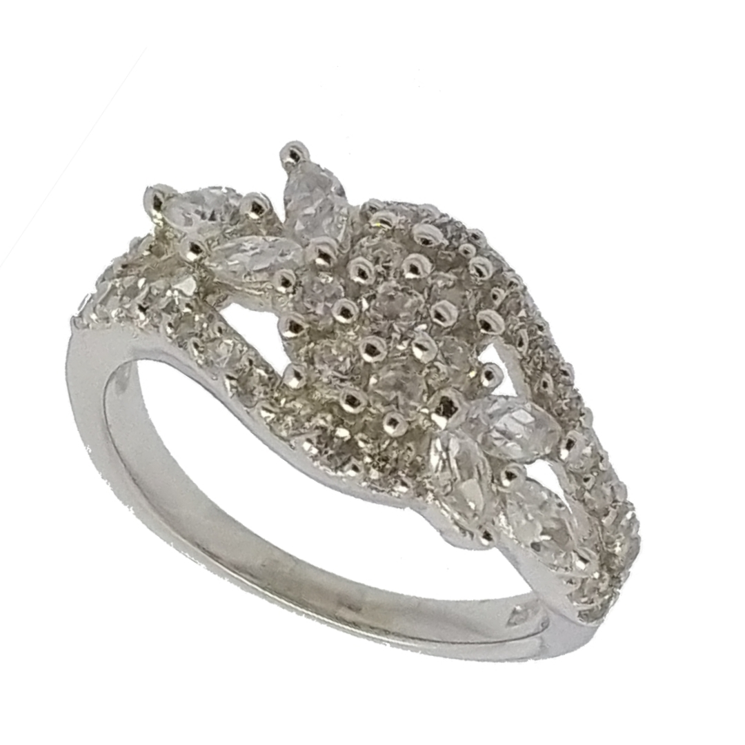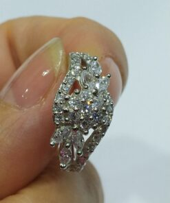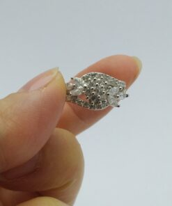 انگشتر نقره زنانه طرح گل با نگین اتمی عیار 925 آبکاری رادیوم و رنگ ثابت و سایز 7 می باشد.این انگشتر پر نگین مناسب خانمها است طراحی زیبا و راحت این انگشتر به عنوان حلقه نیز مورد استفاده می باشد