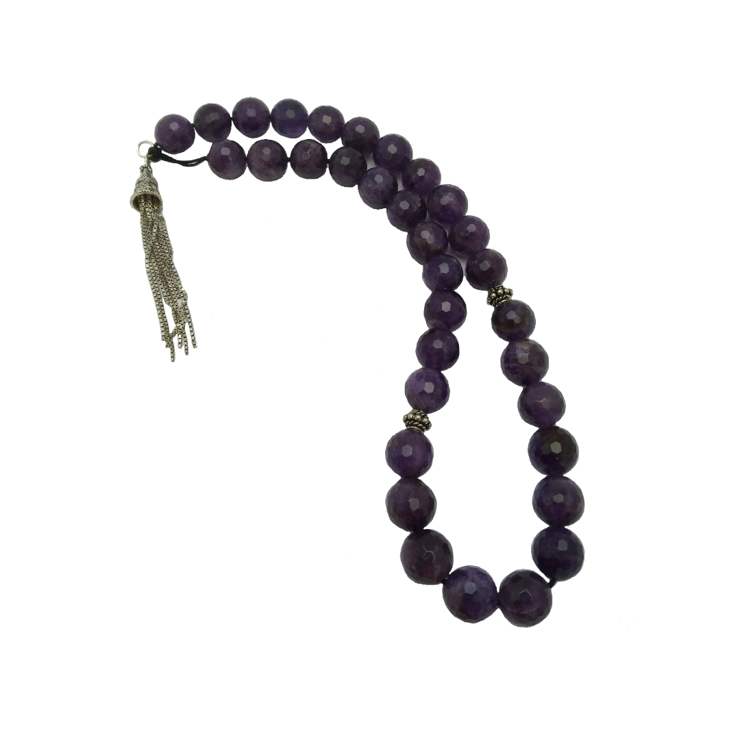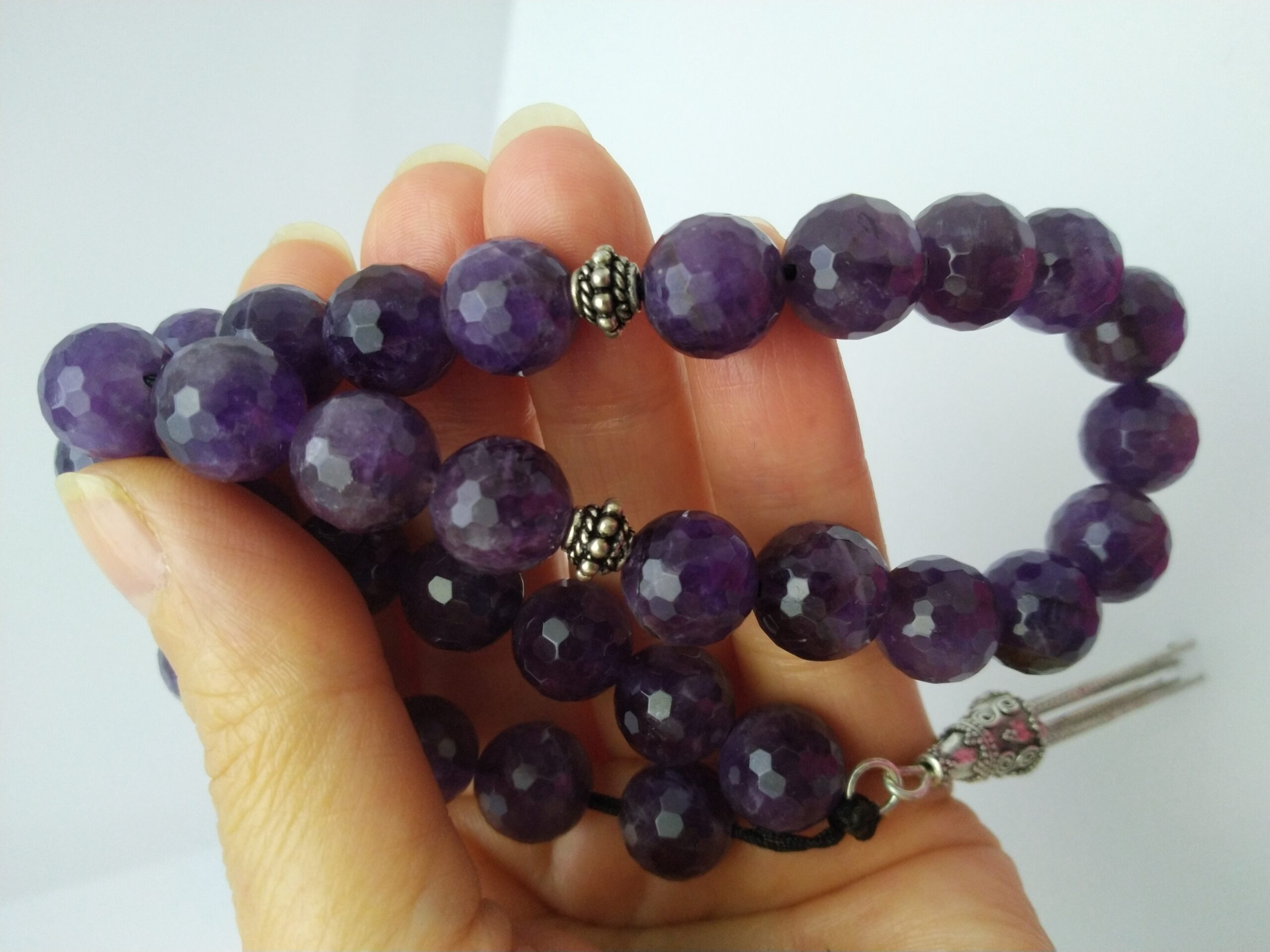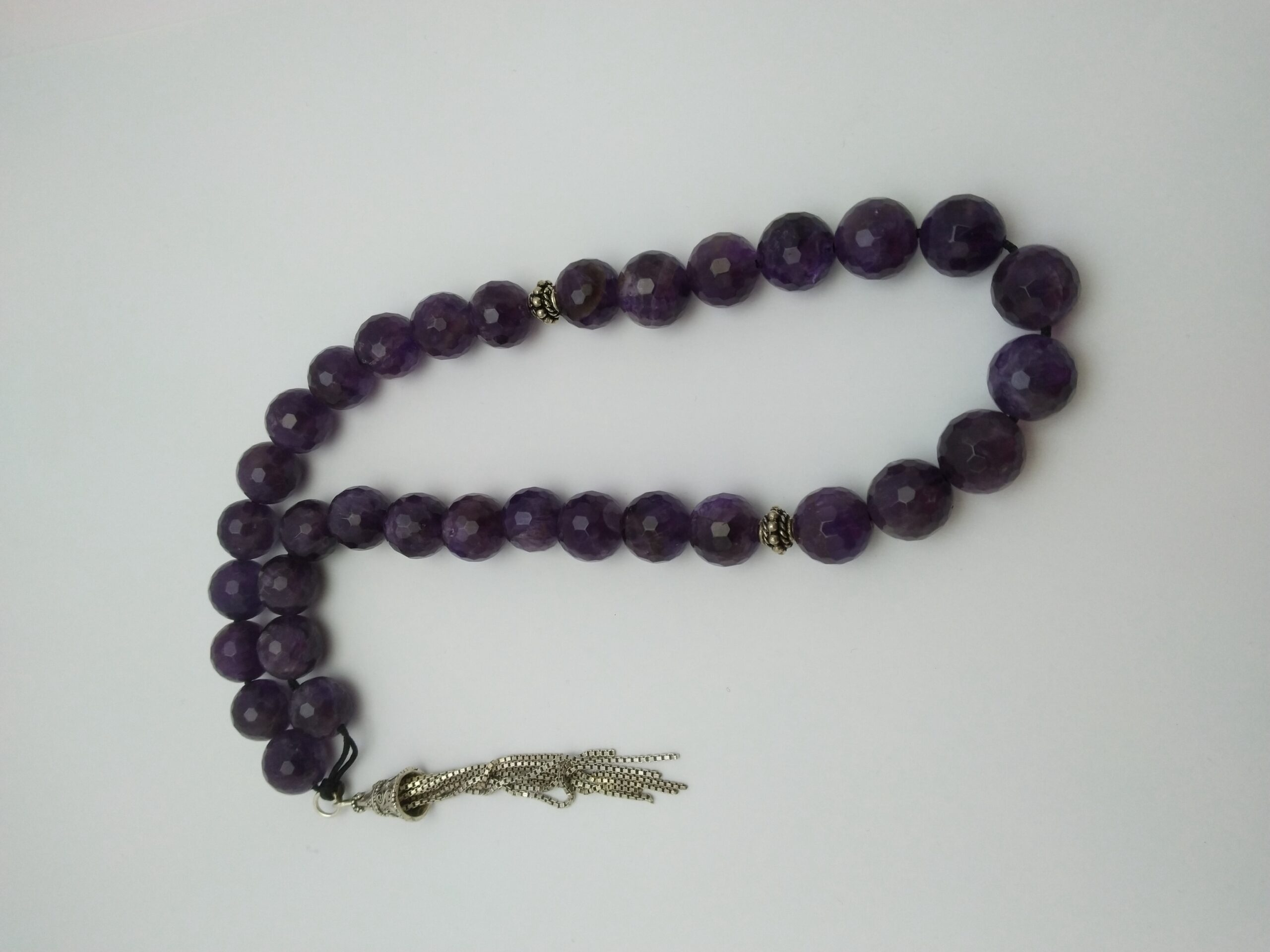 تسبیح سنگ آمتیست مهره ای تمام تراش با رنگ طبیعی اصل و معدنی دارای خواص درمانی مناسب هدیه و ماه تولد می باشد. تسبیح سنگ آمتیست دارای 33 مهره سایز 12 می باشد .تسبیح سنگ آمتیست با 6 گرم نقره ترک عیار 925 کار شده است . وزن تسبیح سنگ آمتیست 81 گرم است . از خواص سنگ آمتیست ، ز ویژگی های آمتیست ، سنگ مخصوص دردهای ناحیه سر، میگرن و فشارهای عصبی است و سیستم کلی بدن را بهبود و در تمرکز حواس و شادی تاثیر دارد. سنگ آمتیست مخصوص چاکرای انتهای سر است .