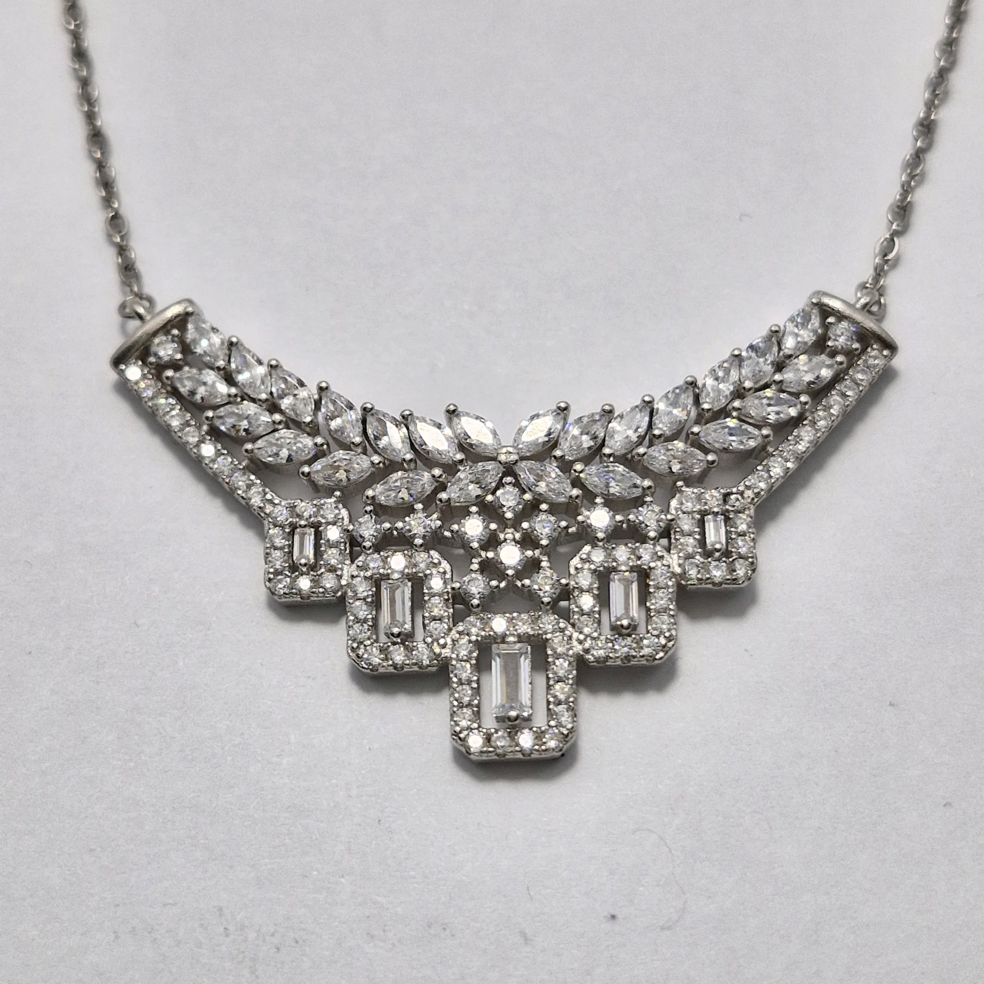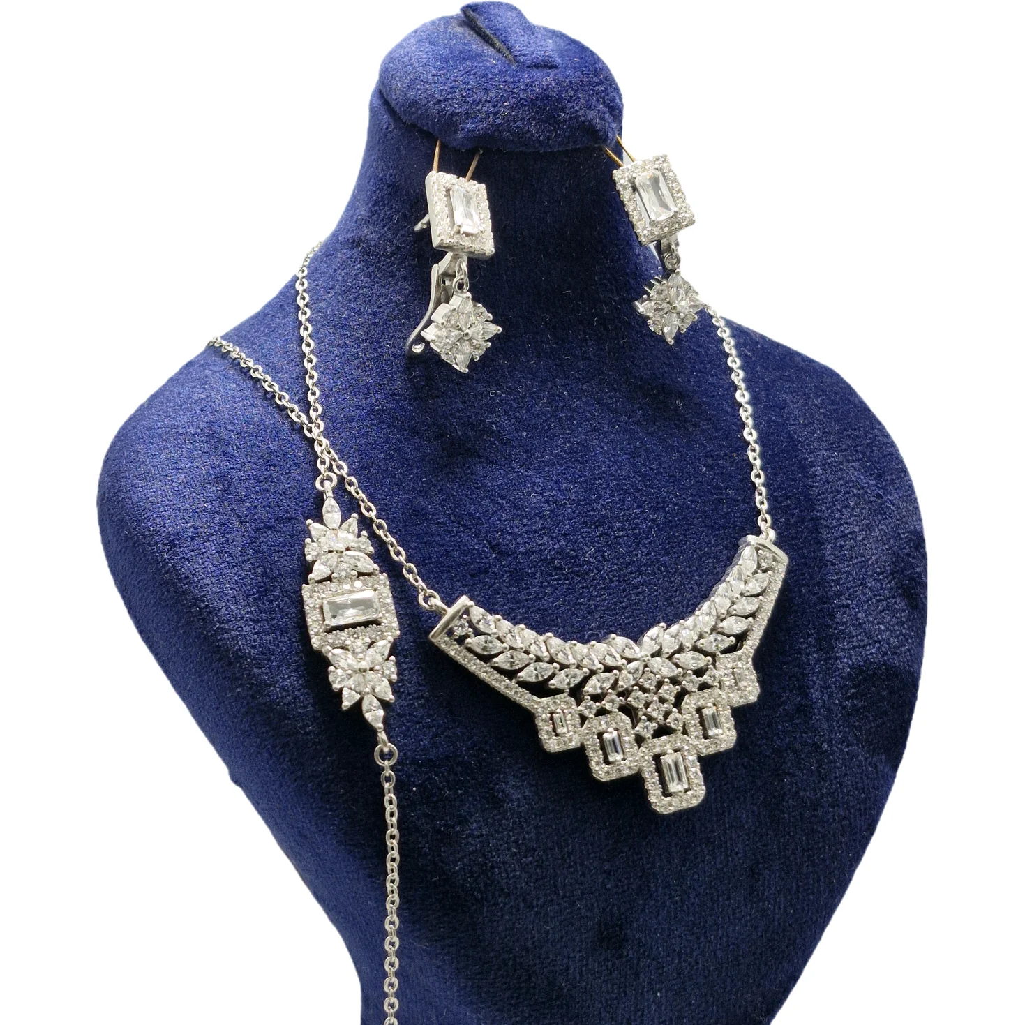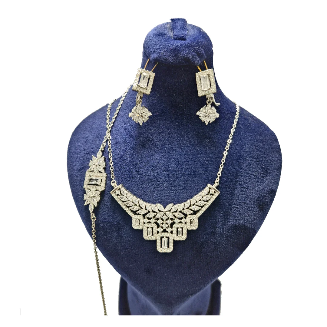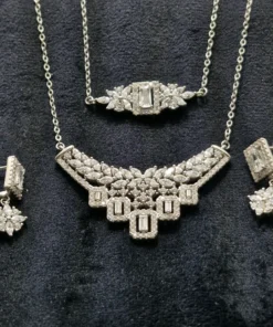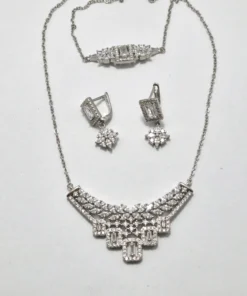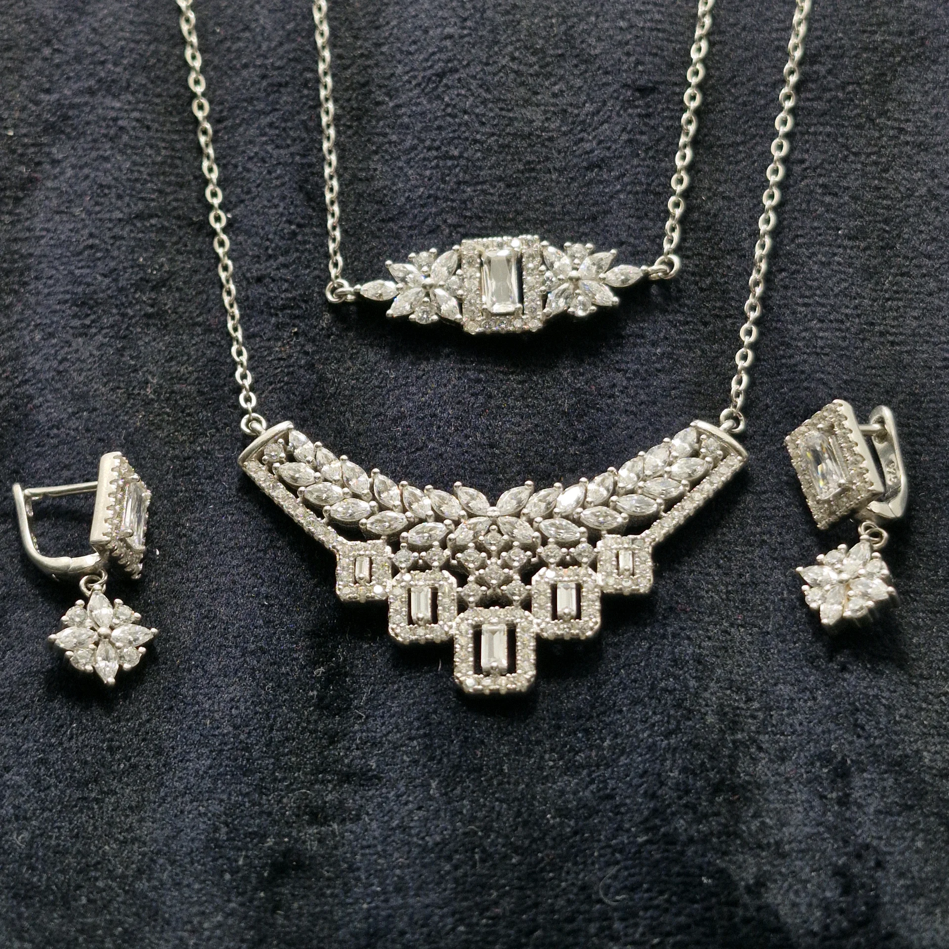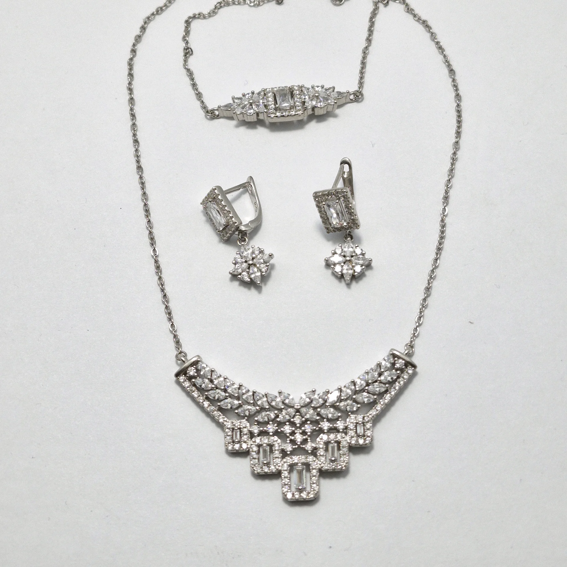 سرویس نقره نگین اتمی آبکاری رادیوم رنگ ثابت ، عیار ۹۲۵ ، این ست شیک و بسیار زیبا شامل گردنبند ، دستبند و گوشواره می باشد. کد Z198 وزن ۱۸.۹ گرم است.